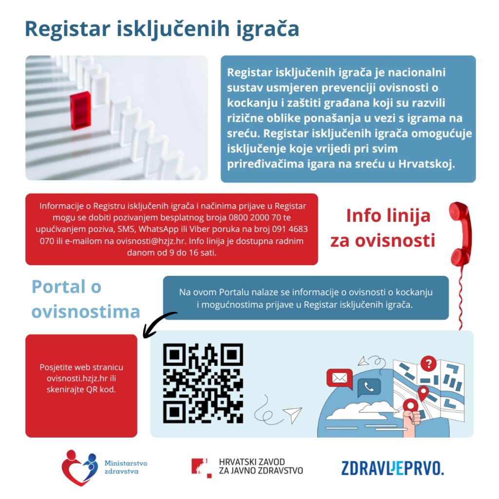 Jeste li znali? Pokrenuli smo Registar isključenih igrača nacionalni sustav za prevenciju. Omogućuje isključenje koje vrijedi kod svih priređivača igara na sreću u Hrvatskoj. Na Portalu o ovisnostima nalaze se informacije o ovisnosti o kockanju i mogućnostima prijave u Registar isključenih igrača.
